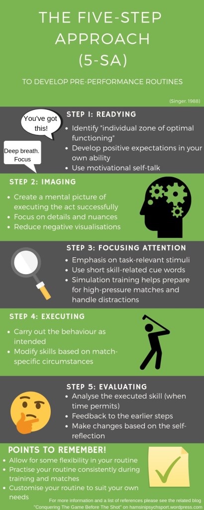 The 5-SA can be applied quite easily to develop effective pre-performance routines and can be adopted across sports and skill levels to enhance performance. Pre-performance routines can be used to learn the desired motor skills and perform at an optimal level consistently. The 5-SA describes a sequence of five stages involved in developing effective pre-performance routines.